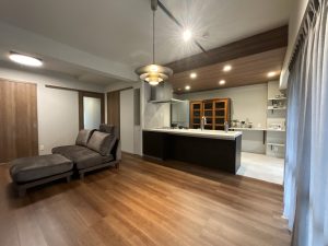お持ちの家具をリノベーション後も使いたいというご要望があったので、その家具も馴染むような空間をご提案しました。写真中央のペンダントライトの下には、K様が大切に使われているダイニングセットを置かれる予定です。