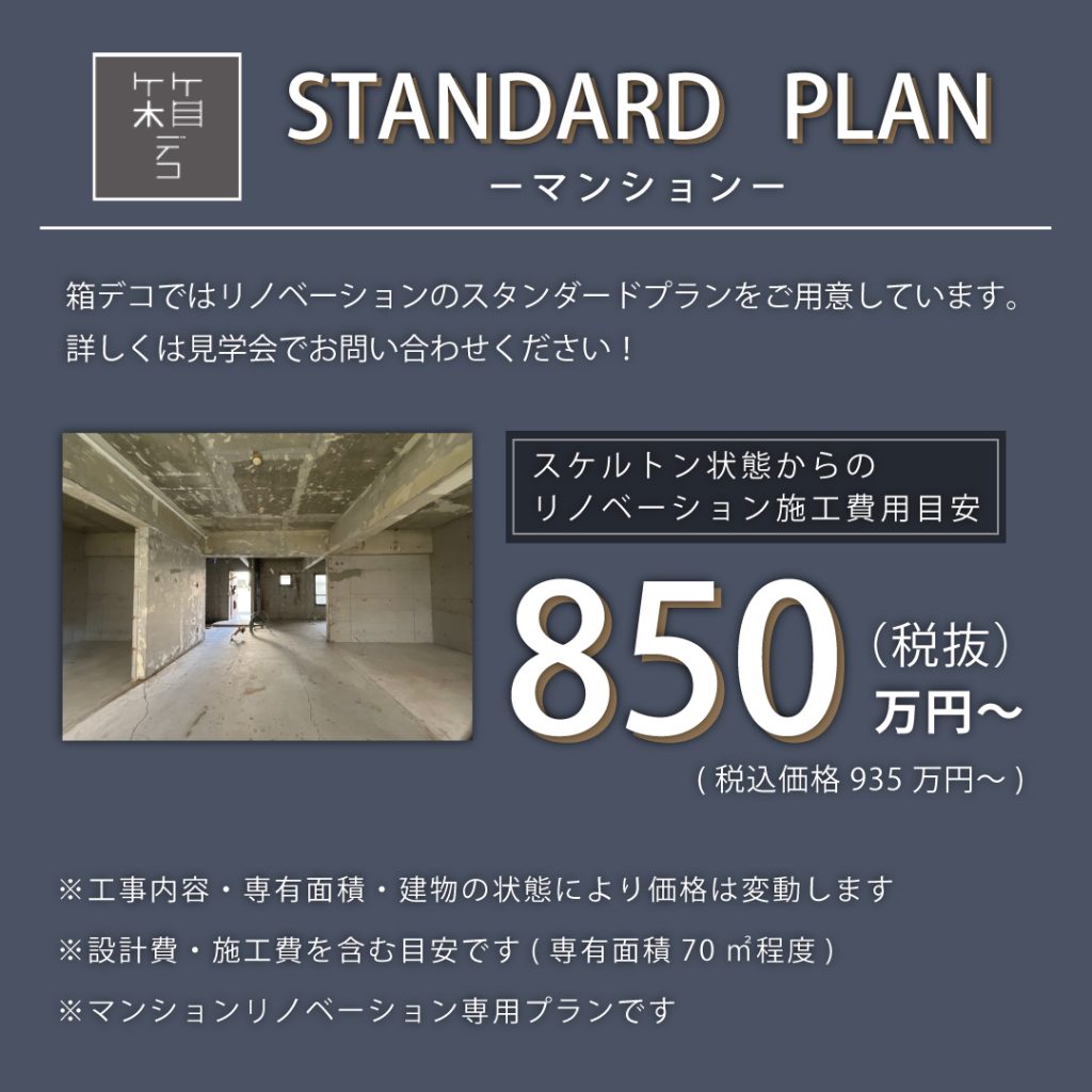 箱デコではマンションリノベーションのスタンダードプランをご用意しています。専有面積が70㎡程度のマンションでしたら、850万円・税抜(税込価格935万円)~ご提案可能です。