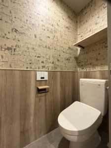 次にご紹介したいのが、トイレの内装です。アメカジ系のデザインを取り入れたいとのことで、壁紙を選んでいただきました。
