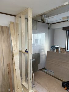 △前回の工事では、既存の腰壁を一度撤去したため、今回は新たに腰壁を造作していきます。