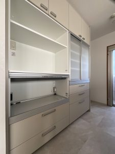 収納を増やしたいというお客様の要望に沿って家電なども入る収納力と使い勝手を考慮したカップボードを取付けました。キッチンとセットのカップボードなので、統一感があります。