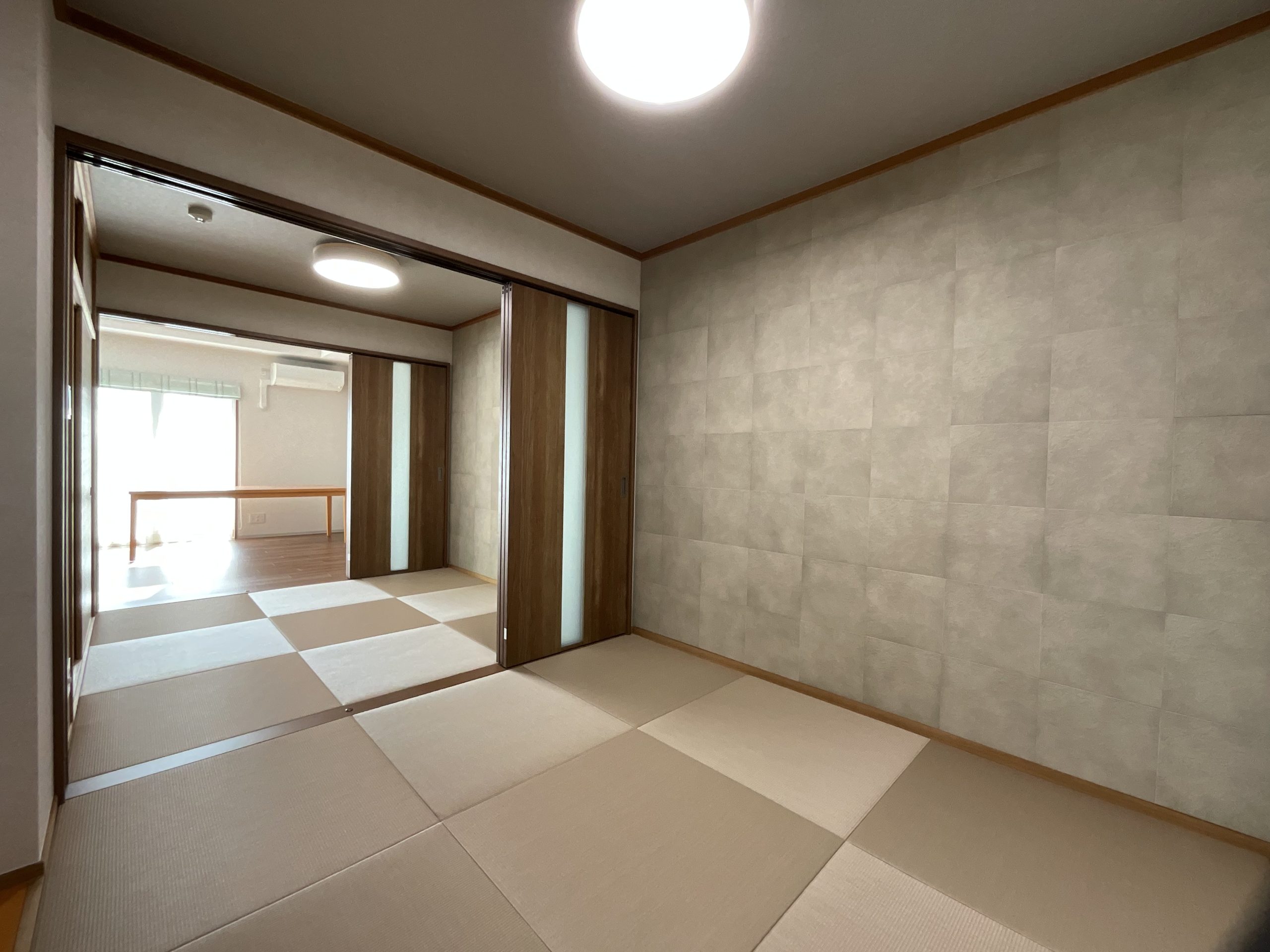 2枚目の写真のエコカラットは既存ですが、とても落ち着きのあるいい色なので、こちらも色を合わせてることで和モダンな空間になりました。リノベーションに合わせて、畳の表替えも同時にご依頼いただき行っています。