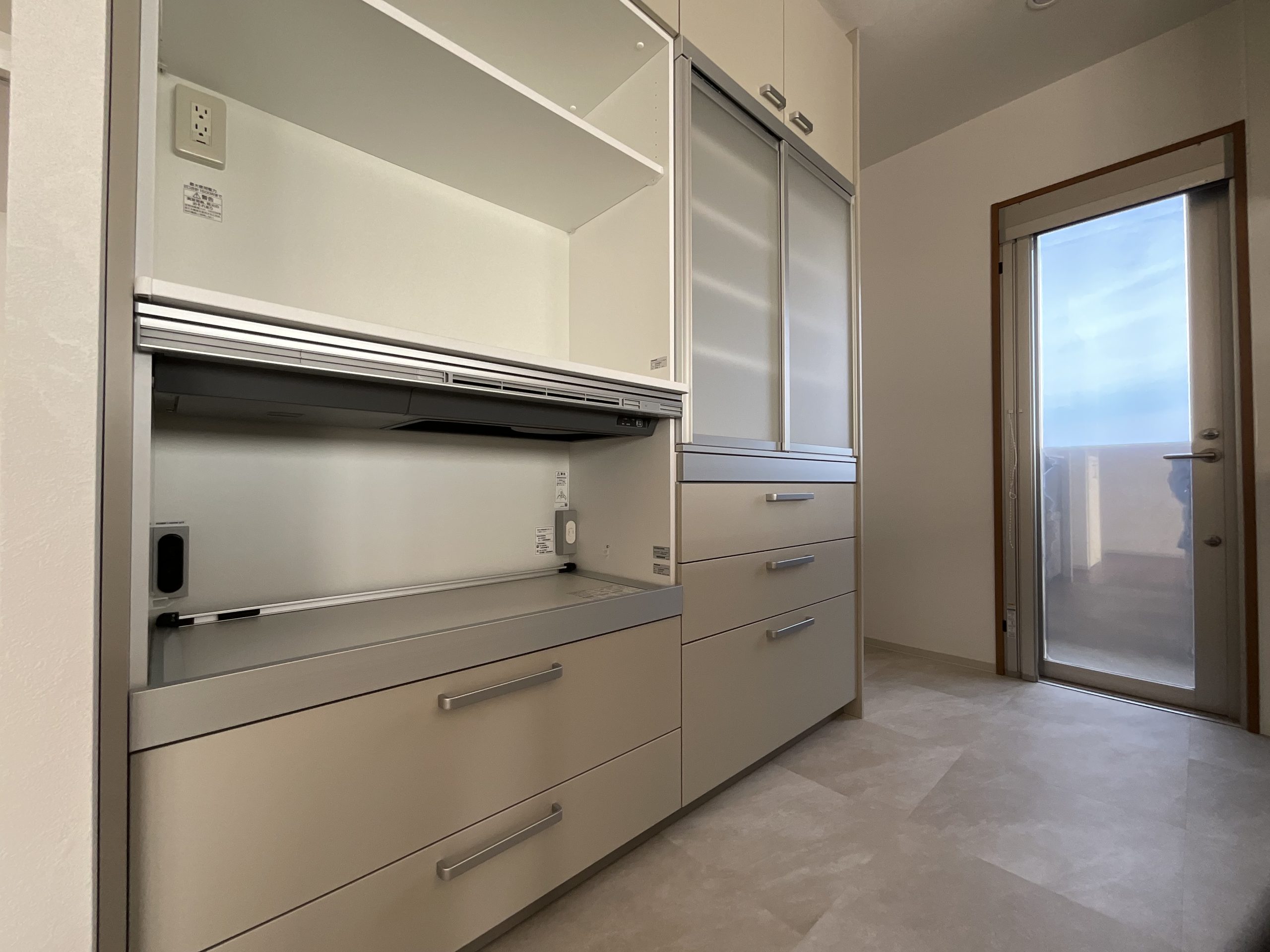 収納を増やしたというお客様のご要望により、キッチン背面に以前より収納力のあるカップボードをご提案しました。家電も食器もたっぷり入る収納力で、使い勝手も良くなりました。