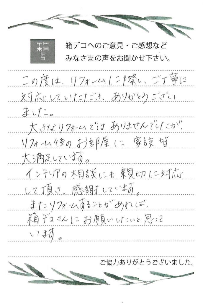 この度は、リフォームに際し、ご丁寧に対応していただき、ありがとうございました。大きなリフォームではありませんでしたが、リフォーム後のお部屋に家族皆大満足しています。インテリアの相談にも親切に対応して頂き、感謝しています。またリフォームすることがあれば、箱デコさんにお願いしたいと思っています。
