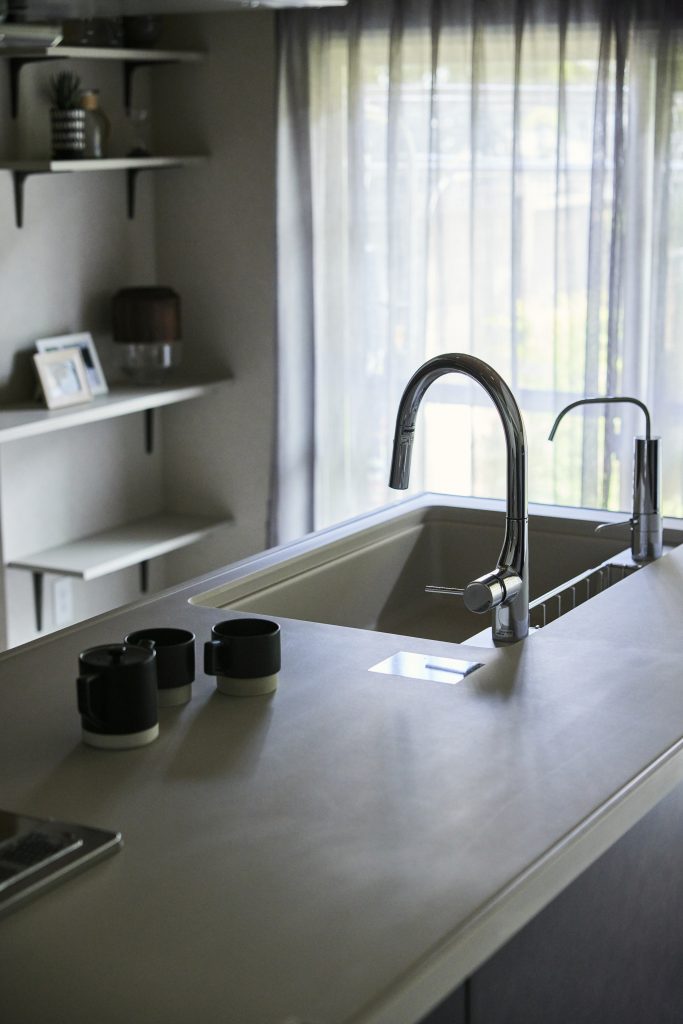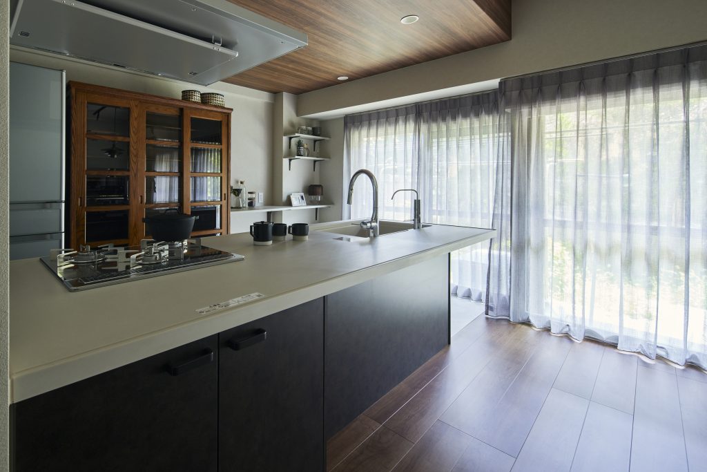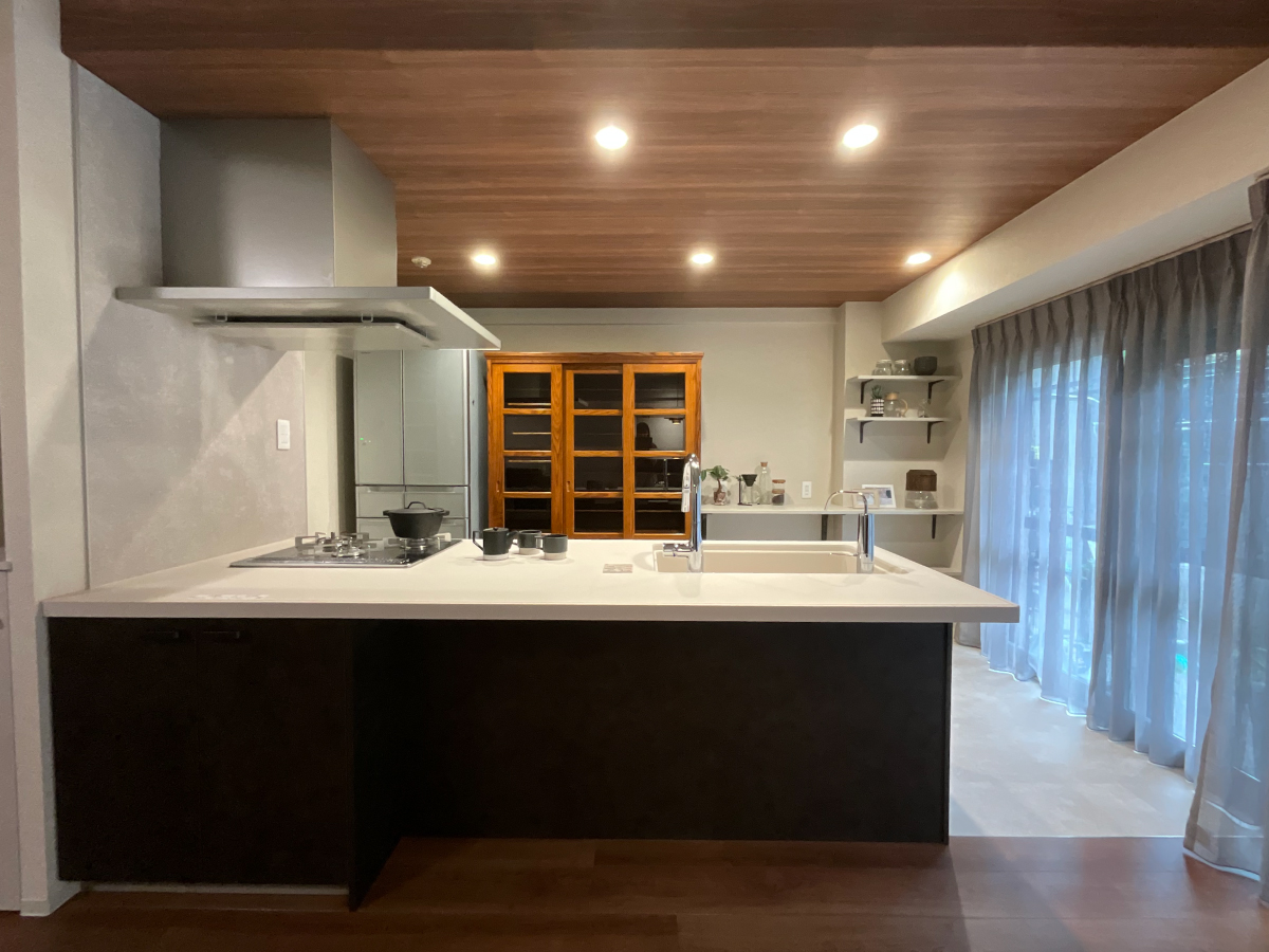 以前のキッチンは壁に囲まれて独立していましたが、リノベーションで壁をなくしてキッチンの向きを変えることで、料理や家事をしながらでも家族の様子が見え、会話を楽しめるように。照明やカーテンなどのインテリアもご提案しています。